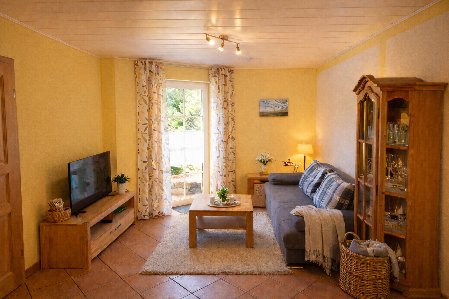 - Ein gemütliches Wohnzimmer mit bequemer Couch und Smart-TV.